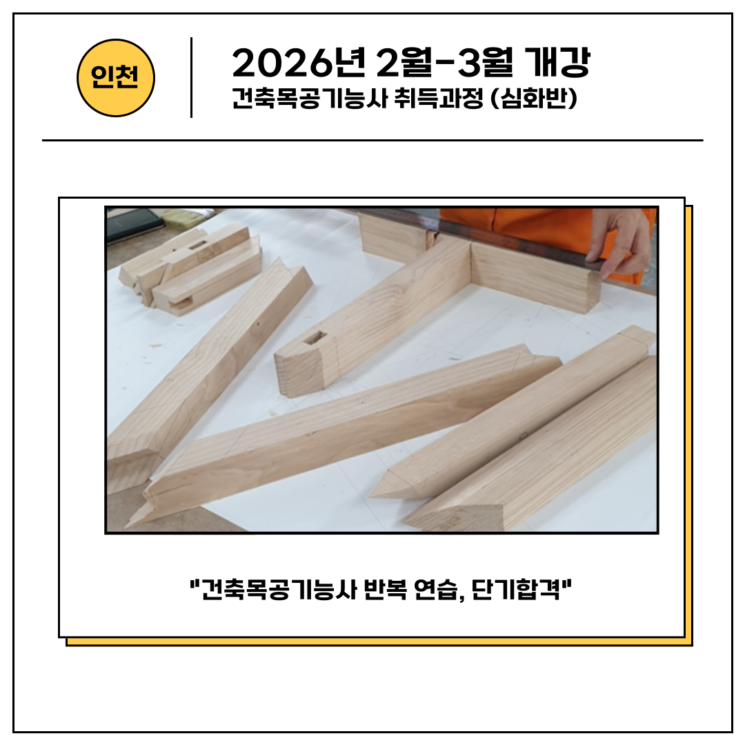 | 이전글 | 공지[인천캠퍼스 1-2월 개강] 건축목공기능사 (기초) 주말과정 |